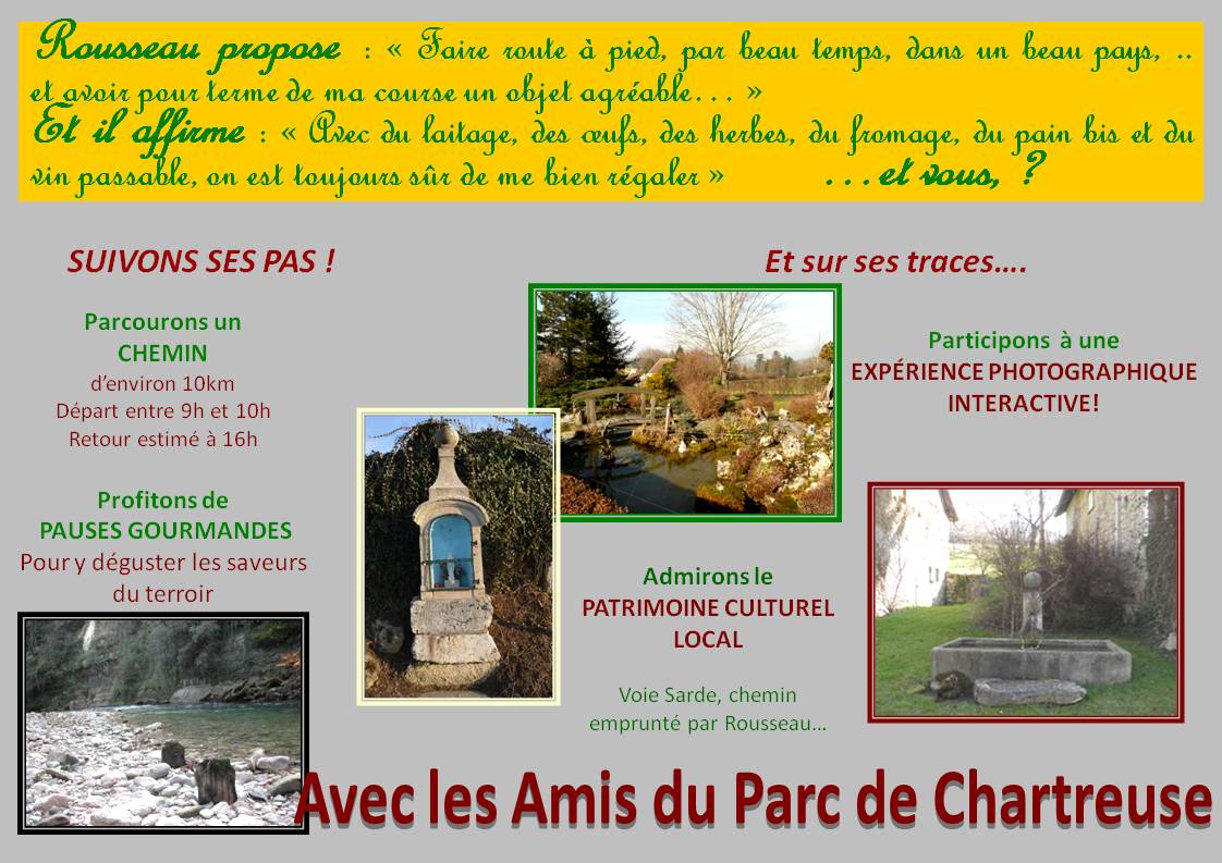 Il s’agira, en cette année du tricentenaire de la naissance de Jean Jacques Rousseau, d’un chemin que le philosophe lui même a parcouru pendant son séjour dans le Piémont savoyard de la Chartreuse (avant pays savoyard)