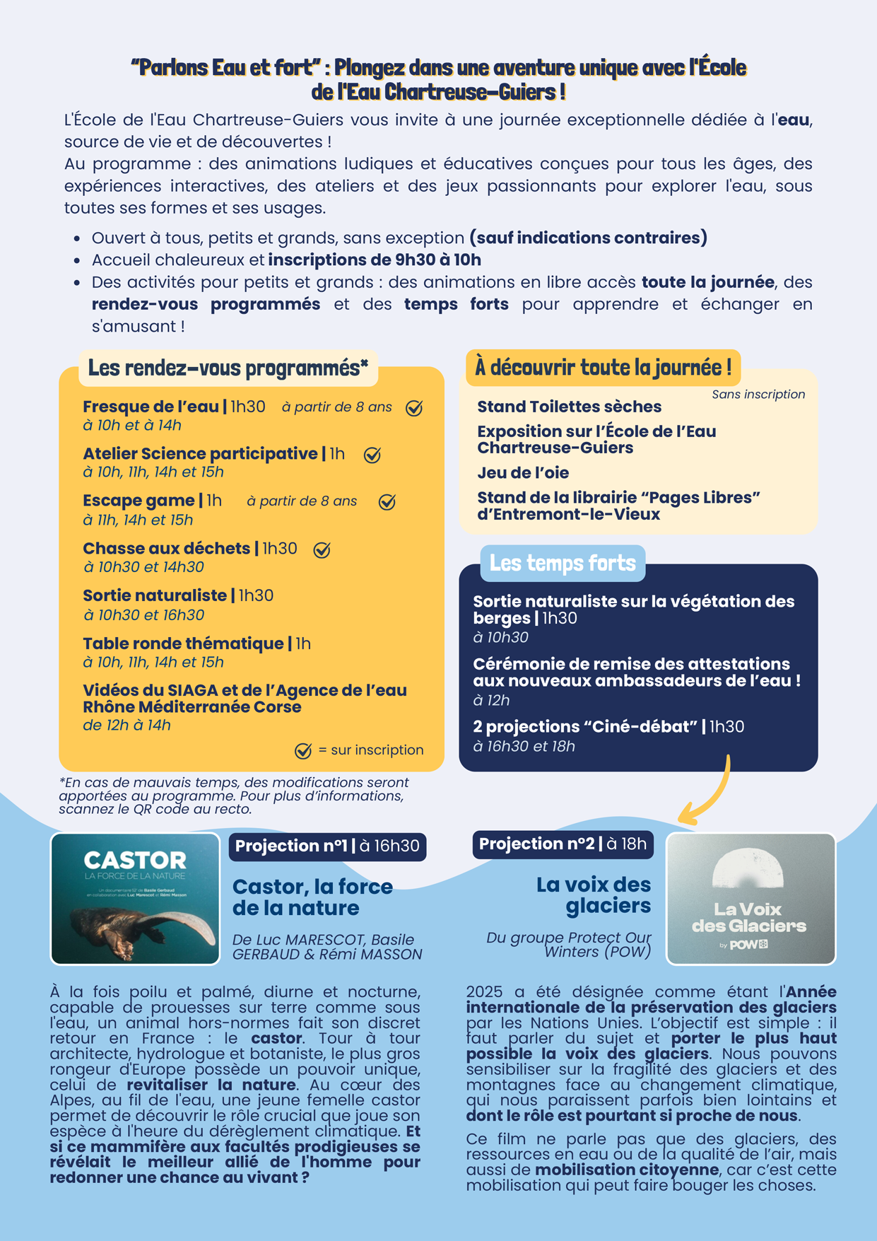 Au programme : des animations ludiques et éducatives conçues pour tous les âges, des expériences interactives, des ateliers et des jeux passionnants pour explorer l’eau, sous toutes ses formes et ses usages.