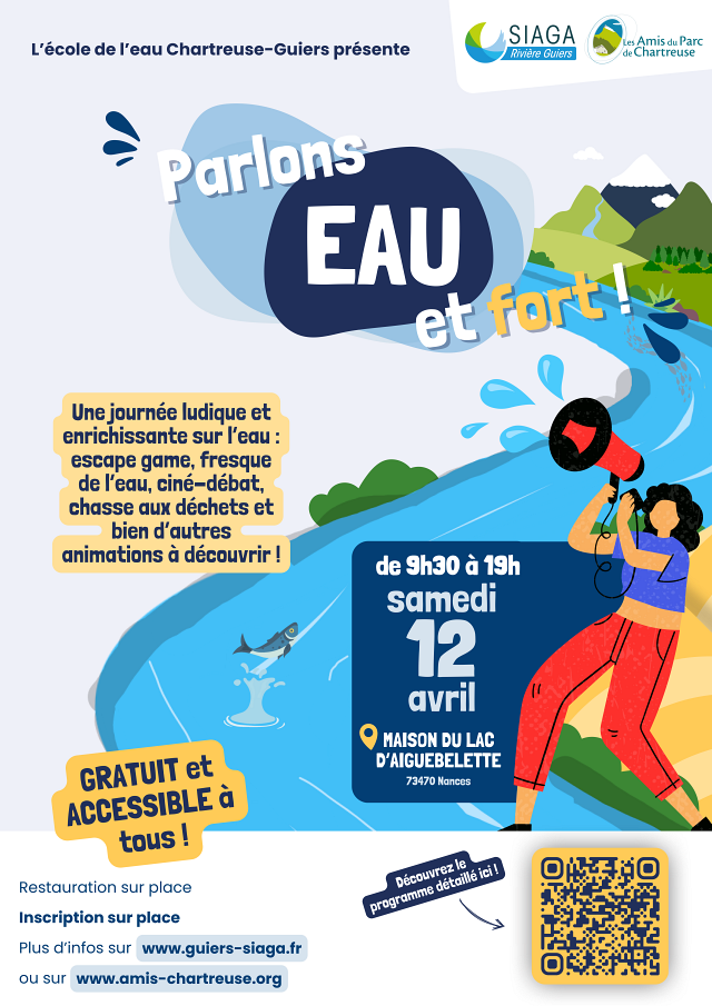 Dans le cadre de notre école de l’eau Chartreuse Guiers, nous organisons une journée finale de restitution et de sensibilisation au grand public sur l’eau : "Parlons EAU et fort !" le samedi 12 avril à la Maison du Lac d’Aiguebelette à Nances.